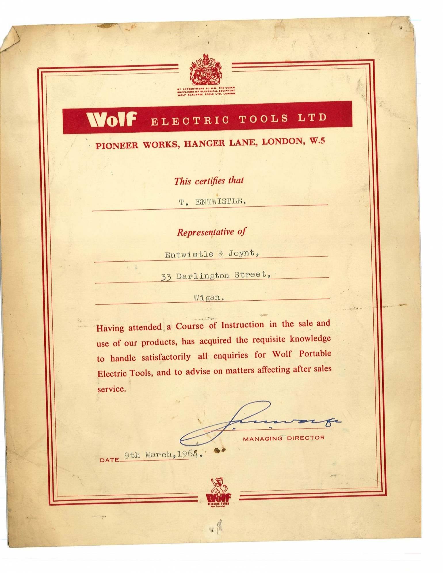 Having set up their business to serve the engineering businesses in and around Wigan, Entwistle & Joynt made an early move into power tools. Having bought their first shop at 33 Darlington Street, the founders only had £500 spare for stock. On opening day, a lot of the boxes on display were empty!