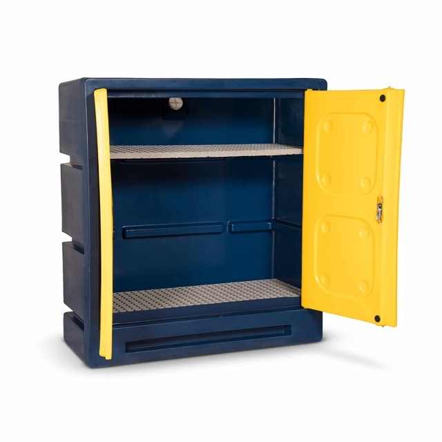 - A durable plastic chemical storage unit, complete with two removable heavy-duty plastic mesh shelves with a load capacity of 250 kg per shelf.