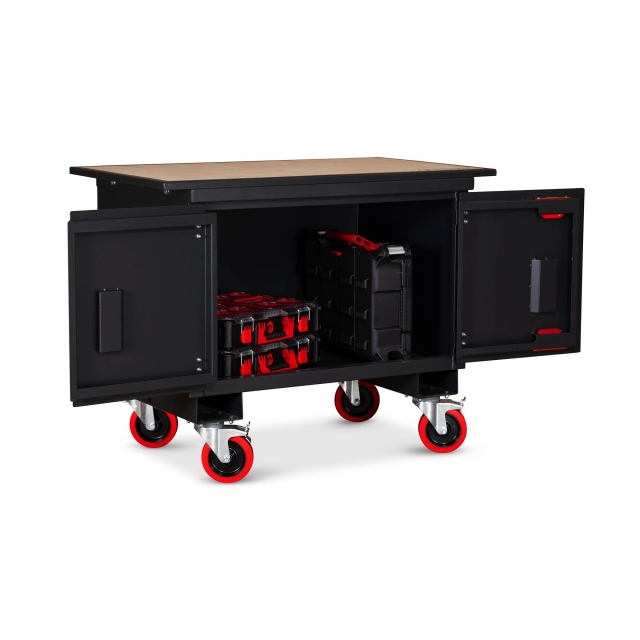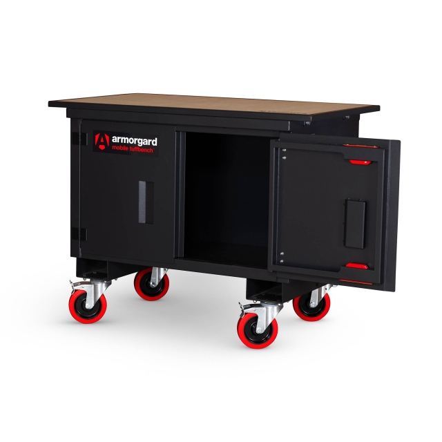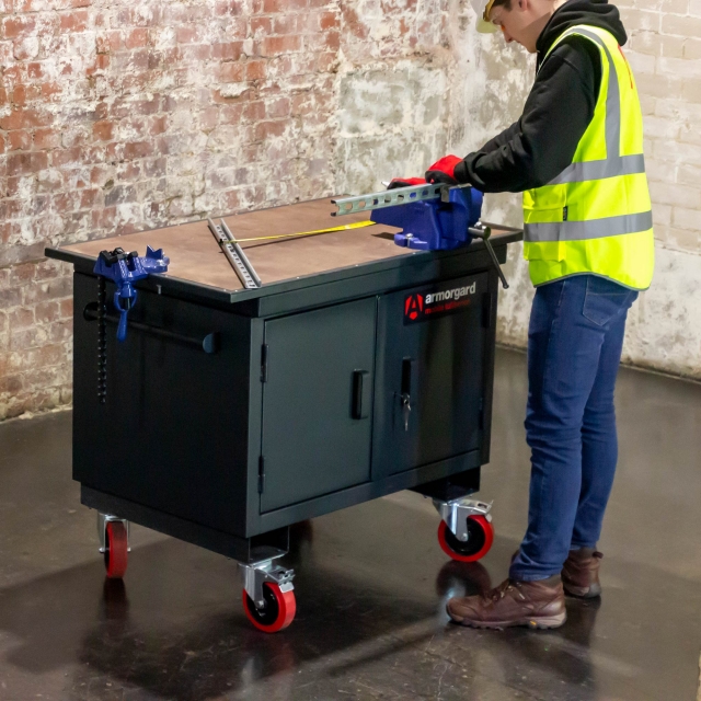 The universal mobile workbench thats also a heavy-duty cabinet! Use the Armorgard Mobile TuffBench for a day and youll wonder how you ever got by without it. A combination of heavy-duty storage cabinet and multi-purpose work surface, this innovative workbench makes any job that bit easier, while ensuring that your tools and equipment remain safe from thieves and damage. Its ultra-tough surface is ideal for fixing chain vice, engineers vice and other equipment, making it indispensable for M&E contractors when pipe threading and bending.