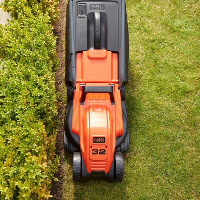 The Black & Decker BEMW451-GB is a great option for keeping your small lawn tidy. This lightweight and compact electric mower is easy to use and maneuver around your garden, making mowing a breeze. At 1200W, the BEMW451-GB packs a powerful punch, and its 32cm cutting width is perfect for smaller lawns up to 300 square meters (that's about 1.5 tennis courts!). Plus, the 35-liter collection box means you'll spend less time emptying clippings and more time enjoying your outdoor space. When the grass box is full, the intuitive indicator will let you know, and for a clean, even cut every time, the simple height change lever on the wheel axle makes it easy to adjust. And after you're done mowing, the integrated deck handle makes for easy storage.