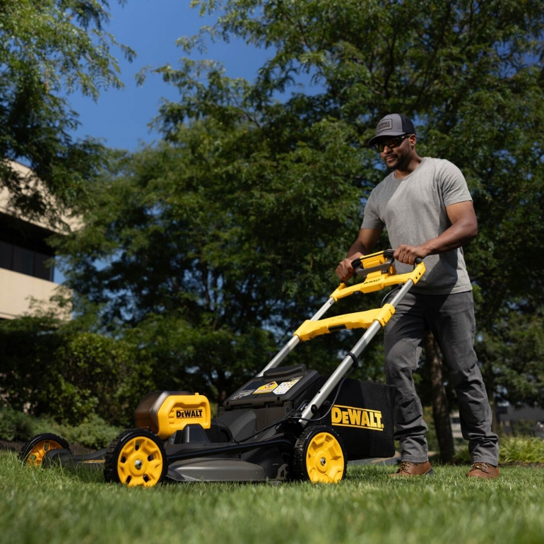 We recommend: DeWalt DCMWSP550NThis 54V XR FLEXVOLT self-propelled lawn mower uses a highly efficient cutting system with dual blades to deliver a 3-in-1 mulch, bagging, and side discharge operation. It is also packed with additional features like variable speed controls, a height-adjustment system, and a useful LED dashboard displaying battery usage, cutting difficulty, and blade end of life.