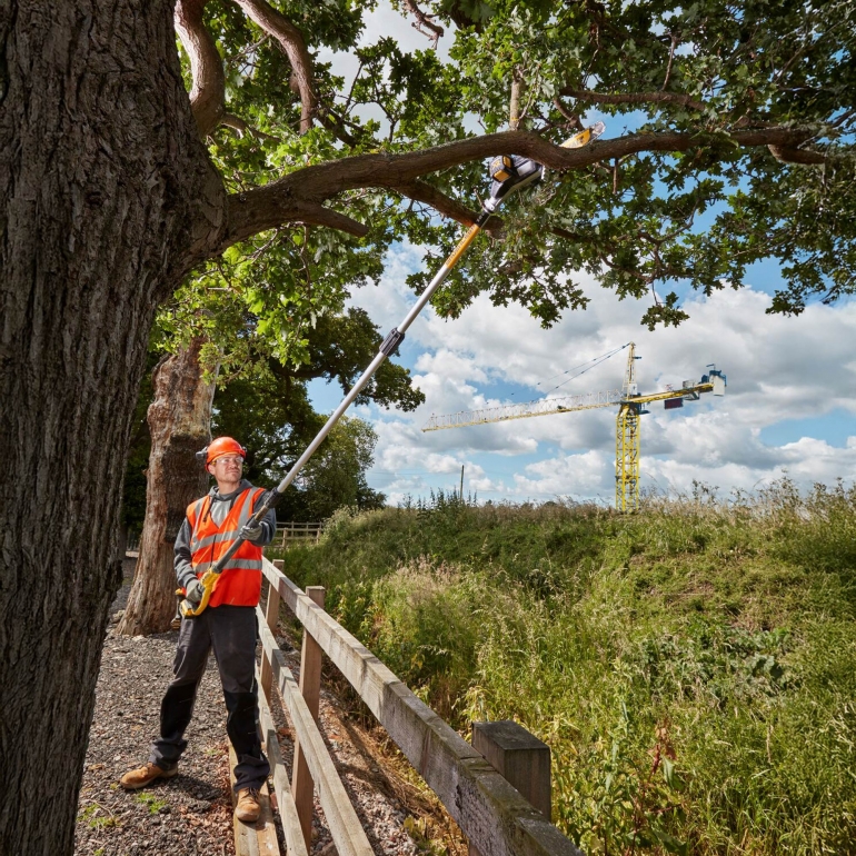 We recommend: DeWalt DCMPS567NWeighing just 4.5kg with a battery, this pole saw is made from light aluminium tubing for ultimate ease of use. Despite its compact body, this pole saw houses a high-efficiency brushless motor and can extend to heights up to 4.5m, making your pruning tasks much easier.
