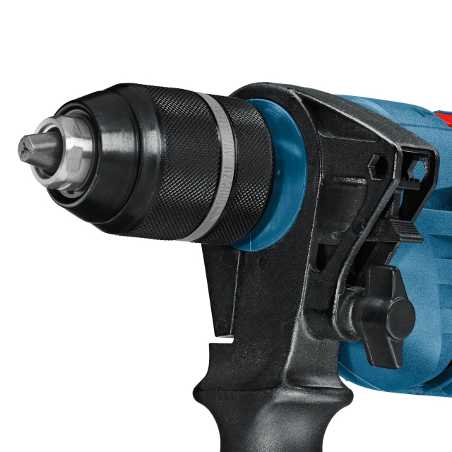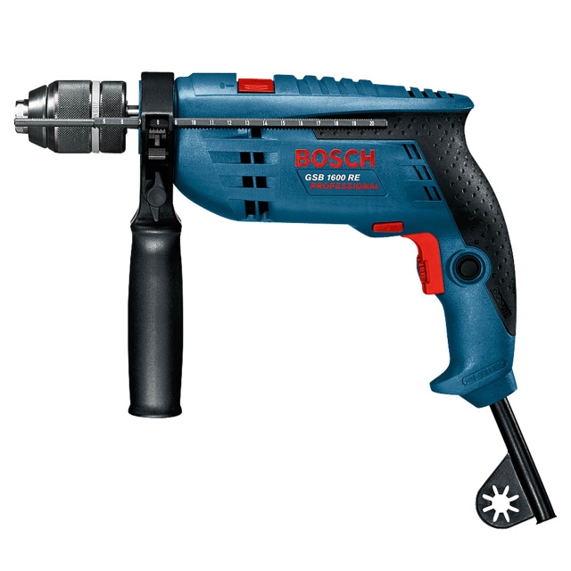 The GSB1600RE is a compact and powerful corded impact drill offering professional equipment standards, ergonomic design and precise control. Its professional features and functions include a metal quick-change chuck, a setting wheel for speed preselection, and both forward and reverse rotation. Its electronic control allows precise pilot hole drilling.
