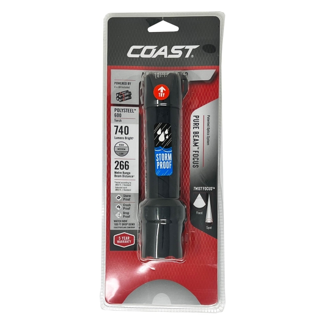 - With Coast's commitment to quality, the Polysteel 600 Flashlight is impact resistant, stormproof and its LED is virtually unbreakable.