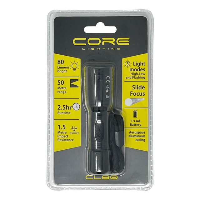 The Core CL80 Focusing Torch is a great value torch designed for everyday use. It runs on a single AA battery (not supplied) and provides an output of 80 Lumens in high lighting mode; there are also options for lower output and flashing light.