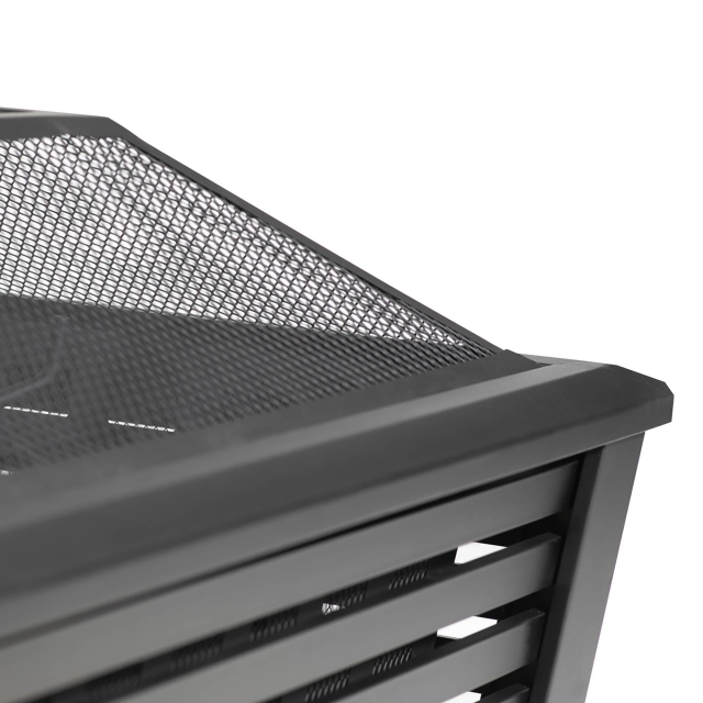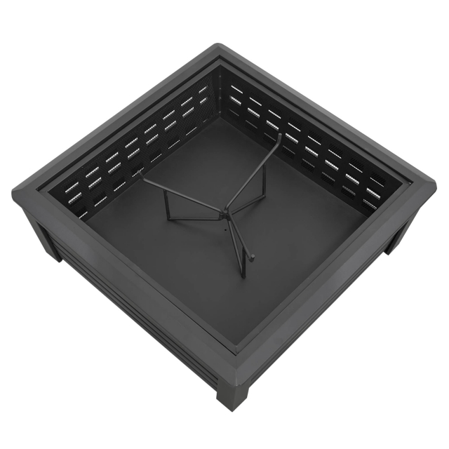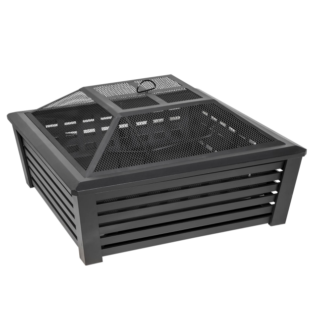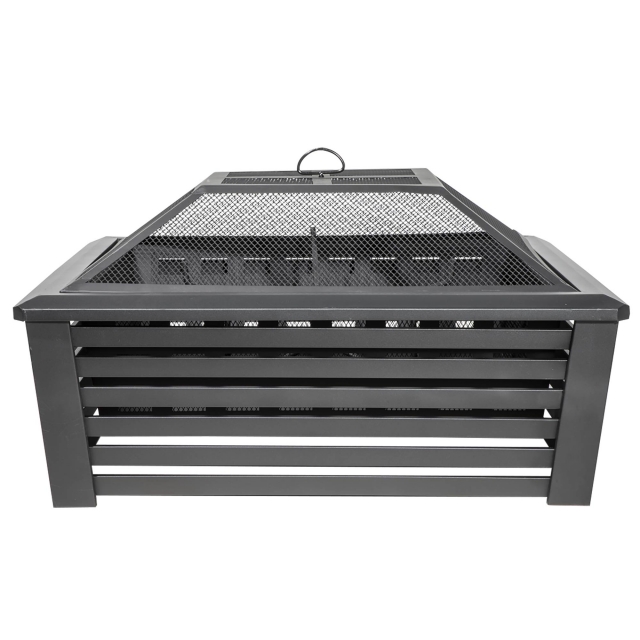 Contemporary style square fire pit is perfect for relaxing outdoors with family and friends. Manufactured from durable steel (0.8mm) with a high temperature black finish. Includes mesh safety screen to prevent embers and sparks flying. Suitable for use with untreated wood and logs. Supplied with fire poker. Some simple assembly required.