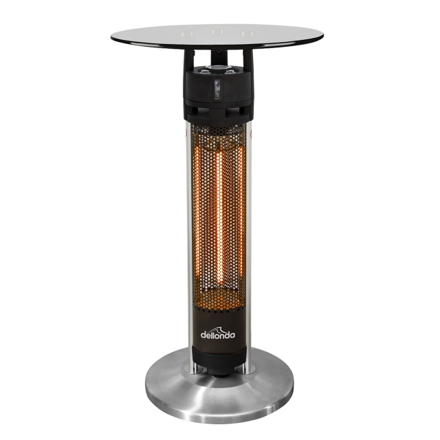 - Powerful garden bistro table with 1600W carbon fibre heating tube. Features handy LED light beneath glass tabletop.