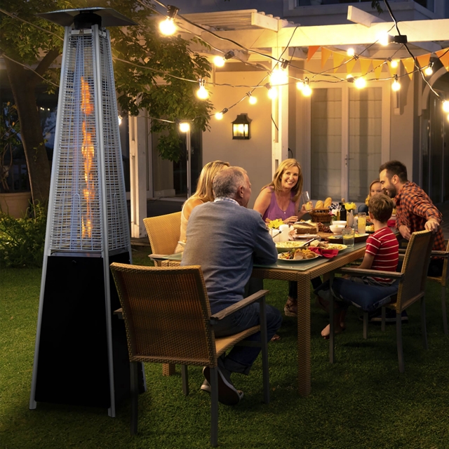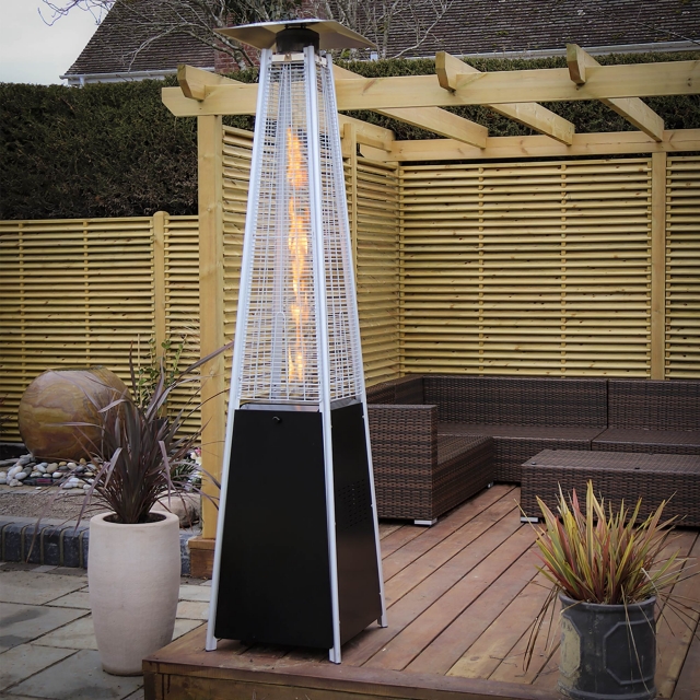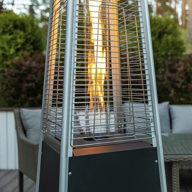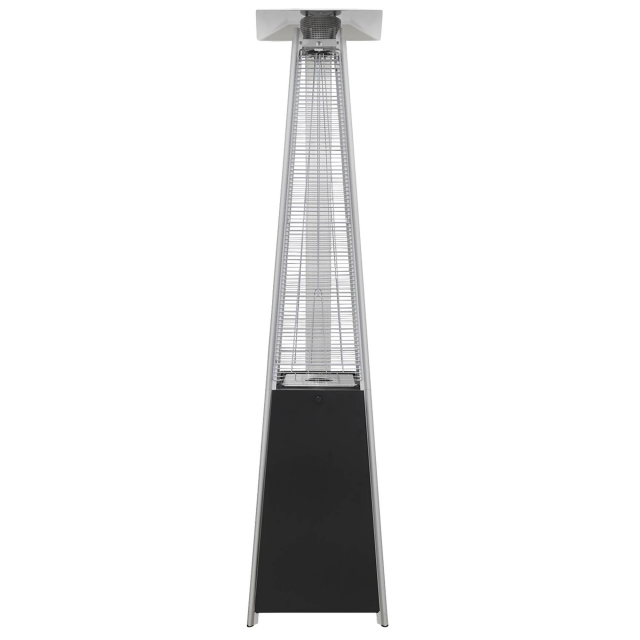 - INNOVATIVE DESIGN - This gas flame pyramid stands at 2.27m tall, when lit the heater produces a real flame encompassed by a glass tube which heats the surrounding area. A metal reflector makes sure the heat is directed downwards and outwards.