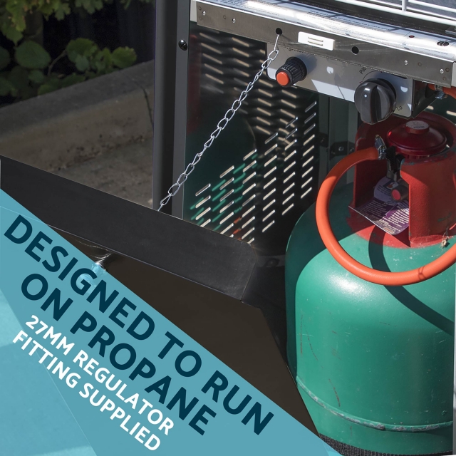 - Supplied with regulator and hose assembly for use with propane patio gas bottles.