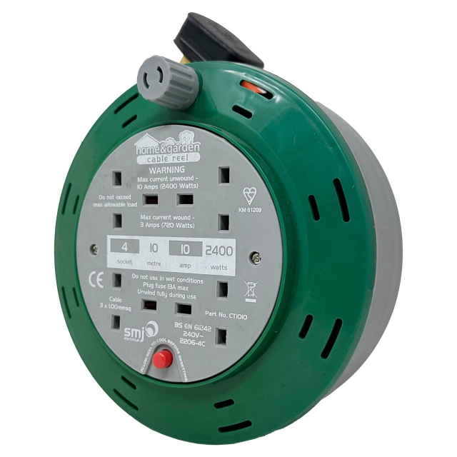 The Deta Electrical CT1010 is a 4 socket, 10 metre cable reel with thermal cut out and a maximum load of 3120 watts. Its compactly designed to fit comfortably in the hand and there is a small handle for easy wind up and use.