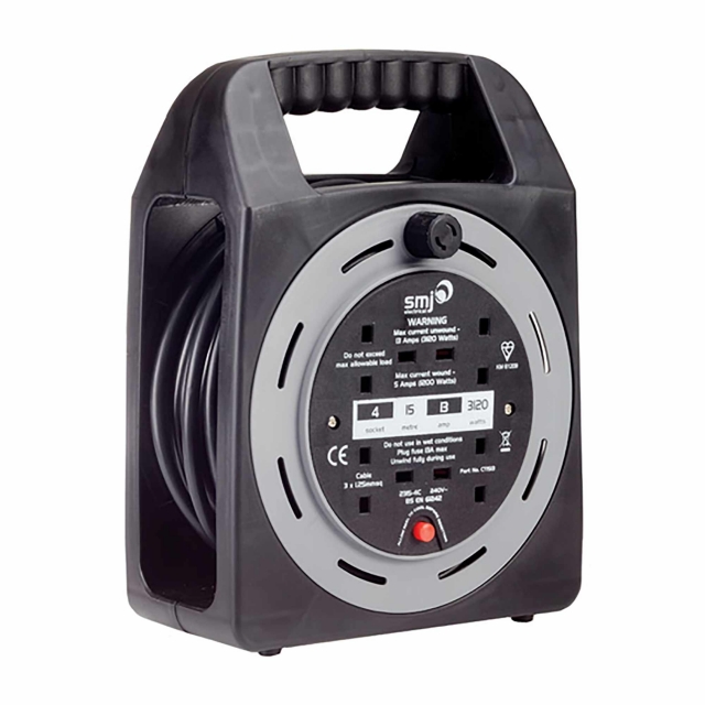 - Portable power solution incorporating 4 socket outlets and 15 metres of cable