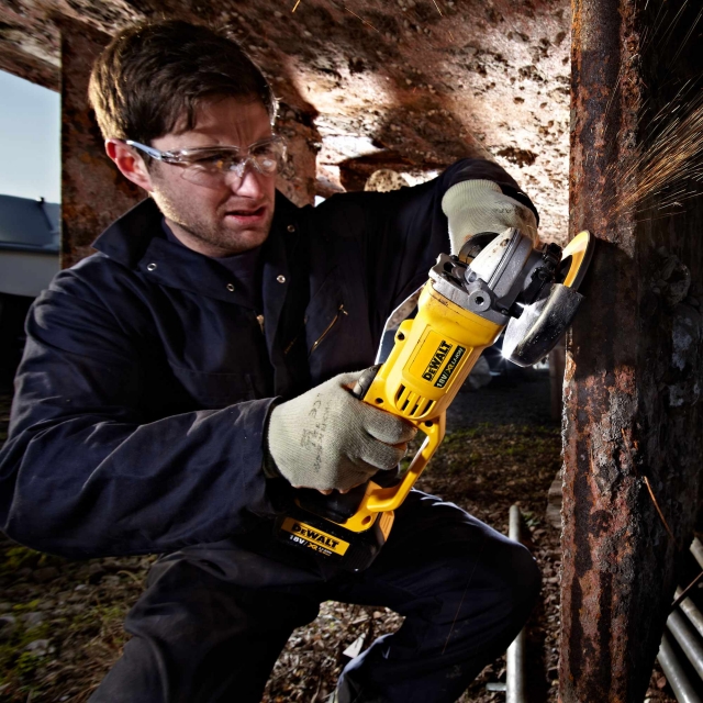 The DeWalt 18v XR Li-Ion Cordless Angle Grinder is ideal for heavy duty cutting and grinding applications and features steel cut spiral bevel gears for durability and low vibration and a 7000 rpm motor.