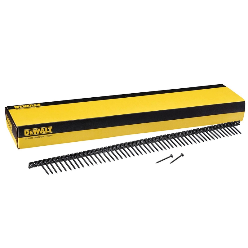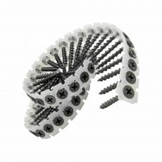 Collated drywall screws featuring a bugle head which countersinks into plaster sheet without tearing the top layer and will set slightly below the surface for a neat finish. The curved surface under the head gently forms the base material without crushing. The screws are collated into a strip, specifically designed for easy and jam-free installation.
