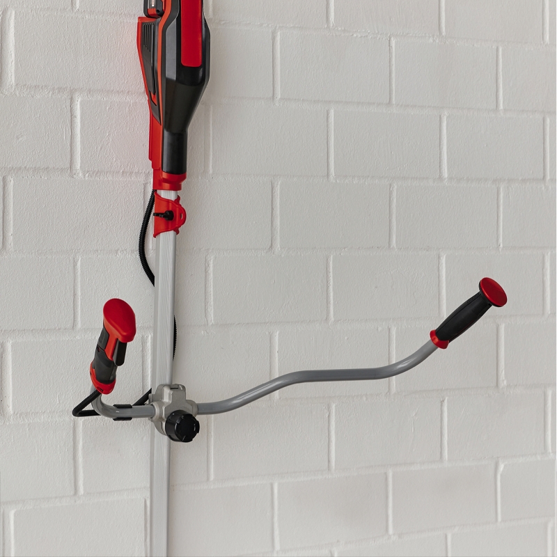 The Einhell AGILLO 18/200 cordless scythe tackles tough gardens with ease. Powered by a user-friendly battery system (sold separately), it features a front motor for balanced handling. Clear tough grass and weeds with the bump feed line spool, or switch to the 3-tooth blade for thicker growth. The adjustable bike handles and ergonomic design ensure comfort during use. The split shaft allows for compact storage, and a wall mount is included.