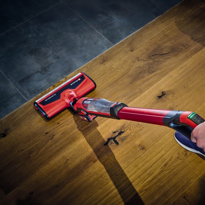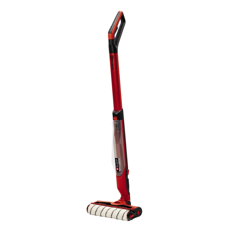 The Einhell Cordless Hard Floor Cleaner CLEANEXXO is your hard-working helper for cleaning around the house, and as a replacement for the mop, it makes the perfect partner for the vacuum cleaner. As a member of the Power X-Change family, the hard floor cleaner can be combined with all batteries and chargers across the system. Thanks to the removable battery system, the cleaner offers unlimited, cordless runtime: when one battery is empty, just insert the next one and continue mopping. The water supply, i.e. flow rate, is controlled directly via a trigger on the hard floor cleaner's handle. When used in the standard and BOOST modes, which change the speed of rotation of the roller, the cleaner removes both regular dust and dirt, as well as stubborn stains. In BOOST mode, the water flow rate also increases when the trigger is pulled. If no water is fed, the roller can also just absorb the moisture from the floor and thus dry it. The floor cleaning brush is moistened by water supplied from the 400 ml clean water tank. The water is collected up again by a special mechanism and fed into the waste water tank (300 ml). Both tanks can be completely removed from the device for filling, emptying and cleaning. Thanks to its slim design and the foldable battery holder, the cordless hard floor cleaner can also reach into corners, edges and narrow gaps without any problems. The cleaner is easy to manoeuvre thanks to its ergonomic Softgrip handle with and always-on function. The supplied parking/cleaning station is perfect for storing the CLEANEXXO. Thanks to its self-standing function, it stands upright. Pressing the boost switch for 3 seconds will activate the self-cleaning function, and special cleaning ridges on the base of the parking station will clean the brush roller. The included cleaning tool can also be used to clean the nozzle or remove debris such as hair from the roller. The hard floor cleaner and cleaning station is easy to transport thanks to its integrated carrying handle. The brush roller is suitable for cleaning various floors such as parquet, laminate, PVC, cork, linoleum and even rougher surfaces such as stone floors and tiles. No tools are required to exchange the brush roller, and it is machine washable. Replacement rollers are available as a separate accessory. The cordless hard floor cleaner comes without a battery or charger.