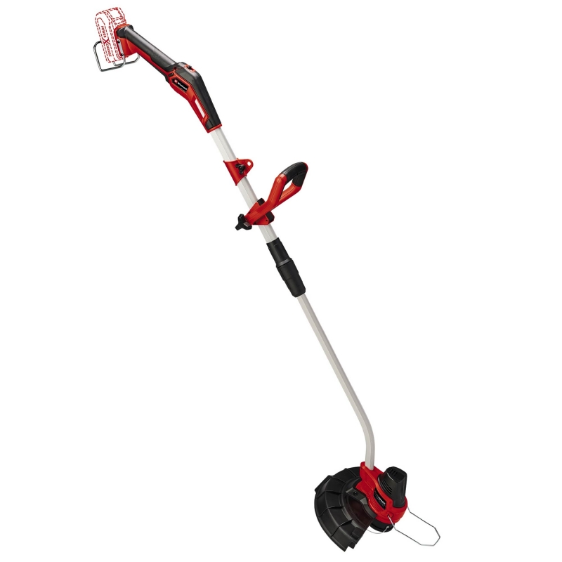 The Einhell Cordless Lawn Trimmer GE-CT 18/33 Li E-Solo handles any gardening challenge around lawn edges, narrow spots and borders. The spool of the trimmer holds an 8 m long, 2 mm thick line, and is driven by a powerful motor with an idling speed of up to 7,000 revolutions per minute. Thanks to the automatic feed system, the trimmer can be adjusted quickly and easily without the need for manual feeding. With its lightweight aluminium handle pole, auxiliary handle and padded carrying strap, this cordless trimmer offers maximum comfort and stability as you work. The slight curvature at one end of the main pole put the motor head and cutter in the optimal position to achieve perfect cutting results. The main handle is also slightly angled, ensuring the ideal wrist position and preventing fatigue. The two speed settings can be used to adapt the speed of the motor to the type of grass being cut. This means even tall grasses are no problem. The Flowerguard protects other plants such as flowers and small shrubs, and even tree bark from possible damage when using the tool. The installed Power X-Change battery is also protected from external damage by a sturdy steel frame. The removable main pole saves space when storing the trimmer. The cordless lawn trimmer is supplied without a battery or charger. These are available separately.